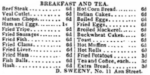 In the 1840s, the decade in which the event allegedly took place, it was the custom of waiters in cheap eating houses to shout orders to cooks while standing at the tables. New patrons unfamiliar with this practice were invariably embarrassed when their orders were revealed to a roomful of none-too-polite patrons.