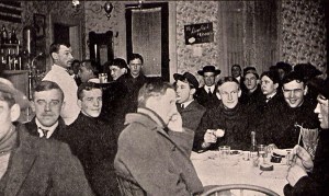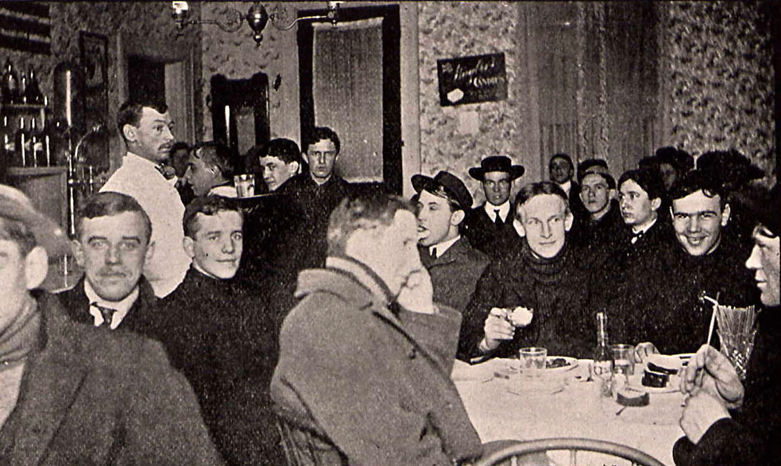 Restaurants clustered around colleges often billed themselves as “student headquarters” and supplied not only food, but entertainment in the form of billiards and supplies such as books and stationery. Hoadley’s, “Hoad’s” to Harvard students, also rented velocipedes in the 1860s. Restaurants around Yale sold weekly meal tickets, hosted private parties, and delivered midnight snacks – “spreads” – to students’ rooms [pictured: midnight “lunch” near Penn State College, 1905]. Billy Park’s chop house in Boston was a hot spot for Harvard students following athletic events. Big-spending students could enjoy the luxurious “sports bar” eateries of their day at places such as Newman’s College Inn in Oakland CA. When it opened ca. 1910 it was decorated with college pendants and tapestries depicting scenes in a man’s life from college to middle age. Murals pictured various college sports while chandeliers were fashioned out of copper and glass footballs.