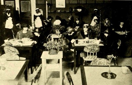 Many 19th-century eating places were restricted to male guests, but students at women’s colleges were supplied with tea rooms in the early 20th century [pictured: Brown Betty tea room near Shorter College]. Near the University of Michigan in Ann Arbor, Almira Lovell’s University Tea Room offered teas along with dressmakers’ supplies and college souvenirs in 1903. Around the same time Smith students could often be found curled up on window seats eating popcorn at the Copper Kettle in Northampton. Well into the 1920s being stricken from a college’s approved list was the kiss of death for tea rooms and other eating places that depended upon patronage of women students. Such was the fate of the Rose Tree Inn in Northampton as well as a tea room near Connecticut College.