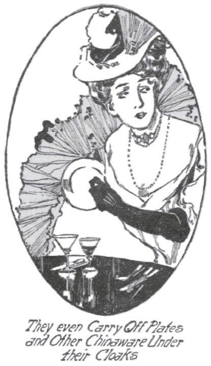 Typically souvenir hunters were portrayed as feeling not the least bit guilty about their some-would-say-larcenous activities. “I must steal one of those lovely things,” said a woman at a fashionable restaurant. Her friends merely laughed. Another received encouragement from her luncheon companions when she declared she wanted to snag a silver match case for her husband. “So she tucked it in her muff and went out with the glee of a smuggler,” the story relayed.
