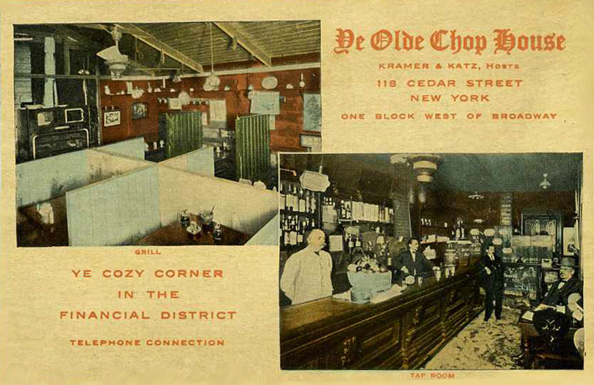 A favorite THFL place in lower Manhattan was Ye Olde Chop House on Cedar Street (pictured pre-Prohibition with sawdust floors beloved by CM) where the club named a waitress “the Venus of Mealo.” The cuisine of chop houses, as might be expected, featured grilled meat and homey dishes such as pickled beets, corned beef hash, tapioca pudding, and rhubarb pie. Far from seeking adventure in the culinary department, Morley once ordered swordfish steak, but declared it “too reptilian.”