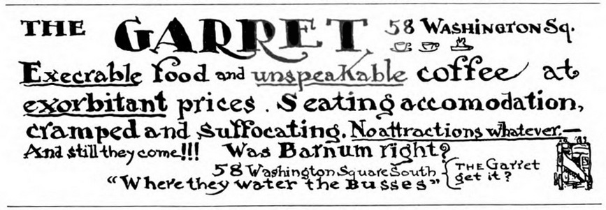 I sense a degree of desperation in the advertisement for The Garret in Greenwich Village. In 1922 when this ad appeared, The Garret’s proprietor was Grace Godwin, single mother of four who ran it to support her family. It was located near the spot in the Village where all the tour buses parked, which should have given it an edge despite the fact that it was housed on the second floor of a dumpy old building. The ad played off the Village’s reputation for zaniness that was so attractive to tourists. Grace gave up the business not much later.