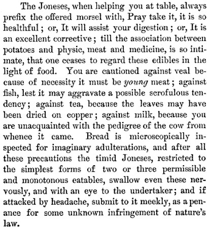 Her style is captured in a short piece called “The Amenities of the Table” in which she described attitudes toward food as represented by three very different couples. Her depiction of the Joneses strikes a note today.