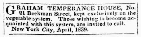 sylvestergrahamhouse1839Graham was disliked for being overbearing and ridiculed as a scientific fraud, but his lectures and books nonetheless won fervent disciples, including a number of well-known abolitionists. A few of his followers started boarding houses for “Grahamites.” So far I have found three in New York City, two in Boston, and one in Rochester NY in the 1830s and 1840s.