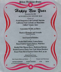 After the war, menus reflected the growing importance of beef on New Year’s Eve – and throughout the year. The 1958 menu at Pike’s Verdugo Oaks in Glendale CA is representative, and not terribly different than menus found throughout the U.S. in later decades. The Raintree Room at the Continental Regency in Peoria IL in 1978, for example, offered beef or lobster, with salad, baked potato or french fries, and the ubiquitous cheesecake for dessert, a standard menu for a restaurant dinner in the last decades of the 20th century.