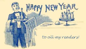 I haven’t found evidence that people celebrated New Year’s Eve in restaurants or hotels much in the 19th century. But in the early 20th century it became a more popular thing to do. Having a reservation at a swanky place conferred status, as the 1912 drawing above is meant to illustrate.