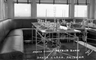 Ninon Rivé Talbott, a well known “subdivider” in L.A., opened the restaurant in 1939 with her husband Edward. It was intended to kick off an associated project, a housing development called Santa Claus Acres on the road leading to the newly completed Boulder Dam (renamed Hoover Dam in 1947).
