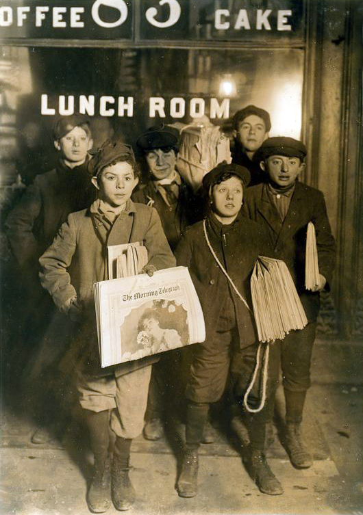 Although coffee and cake saloons were just about extinct by the 20th century, Lewis Hine managed to capture a view of newsboys exiting one in 1908. [shown at top]