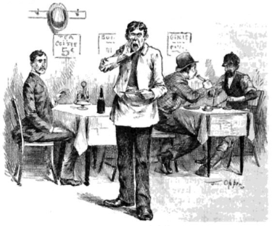 The lack of niceties in coffee and cake saloons was celebrated in a joke that described a waiter’s shock when asked for a napkin in one of these places. He had a quick comeback, inquiring whether the patron wanted his napkin fringed or unfringed. (Surely there were no tablecloths as in this 1889 illustration.)