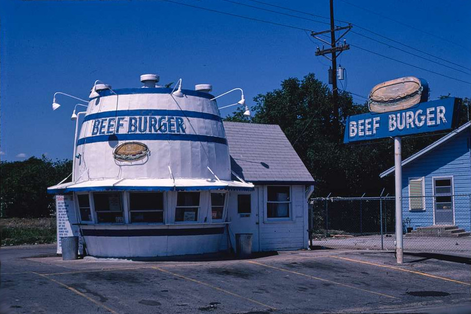 I have selected a few of the hundreds of restaurants whose images he captured. For the most part, these restaurants were not the sort to do much advertising or to be reviewed in newspapers, so they are difficult to research. For example, little is recorded about the barrel-shaped eateries he photographed, such as The Beef Burger in Amarillo TX. I suspect it may have once served as an A&W rootbeer stand.