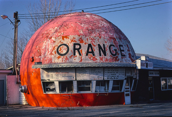 The multi-talented John Margolies spent nearly 40 years on the road taking tens of thousands of photographs of roadside businesses. He focused particularly on those with bright paint, unusual signs, or odd shapes. Often the buildings were amateurish constructions, sometimes abandoned and forlorn looking [above, Orange Julep, Plattsburgh NY, 1978].