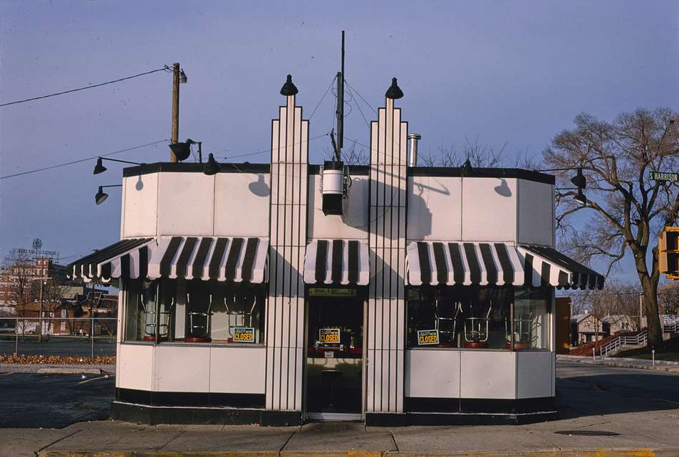 Powers Hamburgers, built before WWII, has survived fast-food competitors and thrives to this day in Fort Wayne IN. It even has a Facebook page. Like the Town Talk Diner, it seems quite different than vernacular buildings such as the Fish Inn and The Boat. Rather than whimsy, Powers and the Town Talk both display the influence of European moderne design as interpreted by professional designers. Powers Hamburgers reminds me of the architect-designed units of the White Tower chain in the 1930s with their white porcelain paneled exteriors.