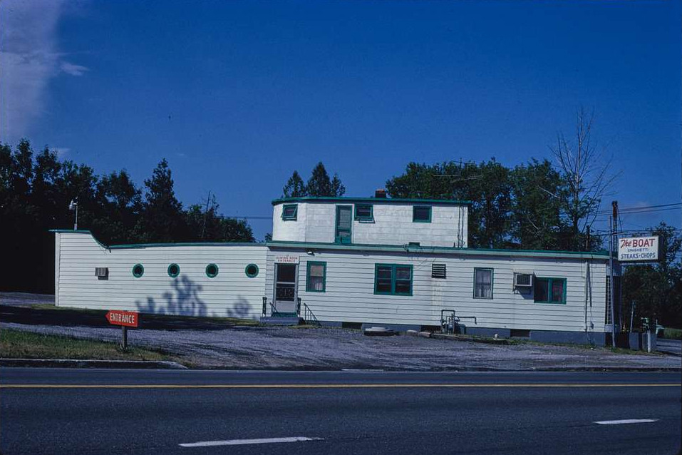 After standing empty for several years The Boat Restaurant in Vernon NY was reopened in 2008, but possibly later closed and demolished. According to a brief note on the Oneida County History Center site, a longtime former owner dated it to 1923. Margolies photographed it in 1988, by which time it had lost a few of its original features. Why the restaurant was built as a boat is unclear other than to attract the attention of passersby. Many eating places have adopted the shape of boats over the years.