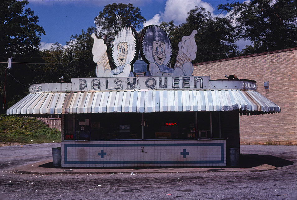 Restaurants and ice cream stands were frequently his subjects, as were motels and gas stations. The photos were notable for the absence of people, which tended to give them a strangely monumental appearance as well as a degree of pathos. The sky was always blue, often cloudless, even if he had to wait for days to take the shot. It is clear that his involvement with these subjects was highly personal. [Daisy Queen, Greenville SC]