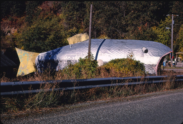 A Spokane WA newspaper columnist in 1936 described it as “a grotesque structure, made in the shape of the fish, with its shingled sides representing scales and the huge mouth the main entrance.” That attitude would change. By the time Margolies photographed it in 1987, appreciation for what became known as “roadside America” had spread across the land and the Fish Inn had been noted as one of its gems. There were other odd structures in the greater Spokane area such as a creamery’s 38-ft tall milk bottles, the Miner’s Hat in Kellogg ID, a giant Paul Bunyan, a tavern in the form of a prairie schooner, and a number of pseudo-windmills.