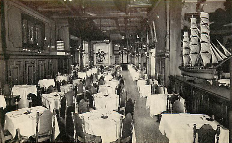 Whatever was the case, he entranced the nation with his observations. When they visited New York for the first time, even readers from small towns might feel they already knew the city because of what he wrote. The columnist who succeeded him recalled that when his outlander cousin came to NY, he said that because of O. O.’s columns he would need no guidance. He declared: “I’m starting at the Battery tomorrow morning, and I’ll have grilled pigs’ feet and German beer at Lüchow’s [shown above]. I’ll just glance in at Fraunces’ Tavern, but I might take a snack at the Brevoort or the Lafayette, and maybe get up to Louis & Armand’s in time for chicken Tetrazzini or a steak at Sardi’s.”