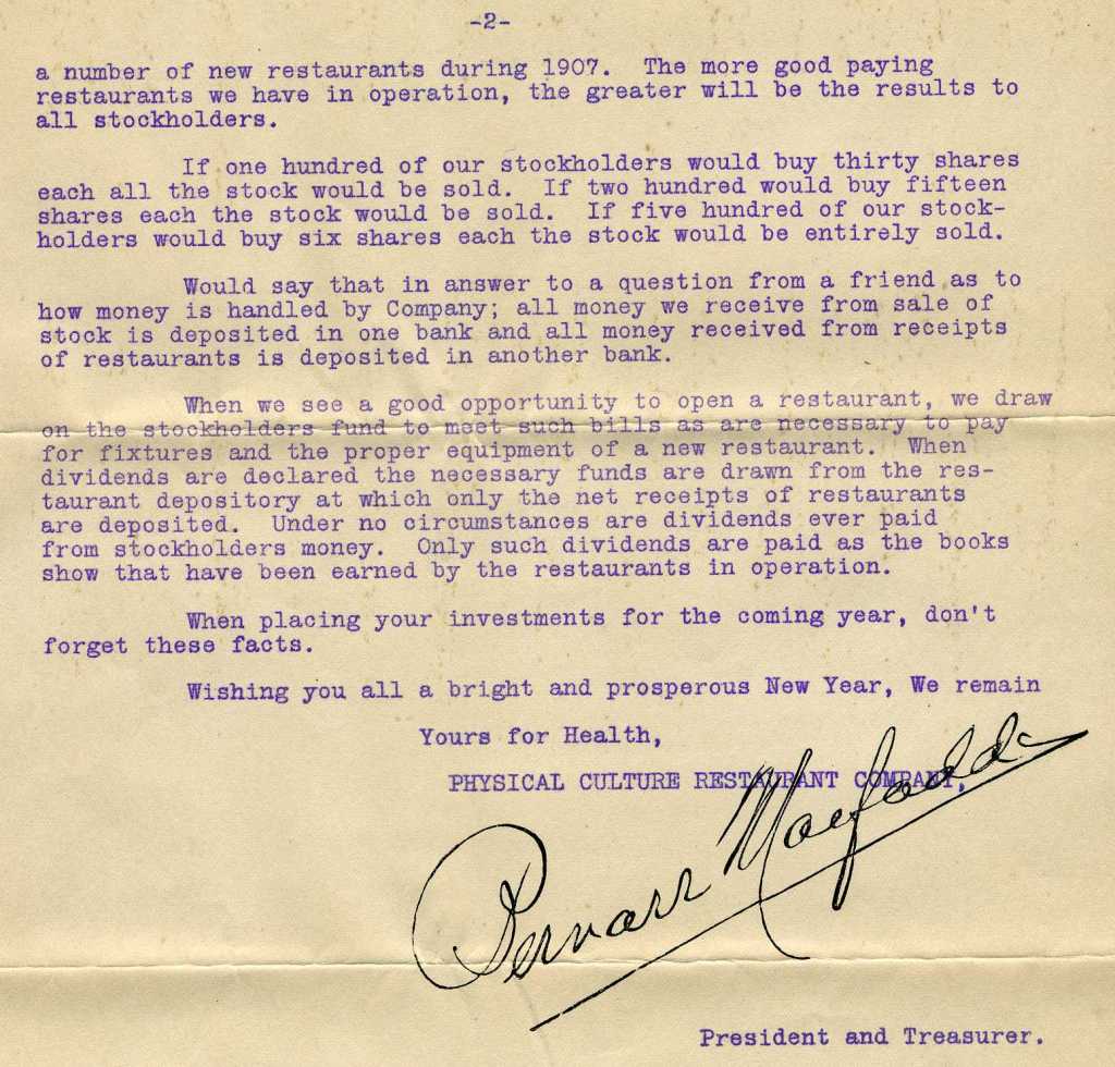 In the 1907 letter to stockholders shown above he floated the idea that the restaurant holdings might grow to 40 or 50 units if stockholders invested in more stock. This never happened.