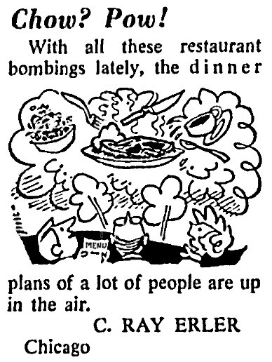Often the bombings occurred late in the night or very early morning, but at other times, especially when stink bombs were used, it was during business hours. Even a stink bomb could put a restaurant out of business, since frequent customers, whose clothes might be ruined in the episode, would probably never return. Plus the restaurant could get a bad reputation. [Above, “humorous” letter sent to a newspaper in 1963]