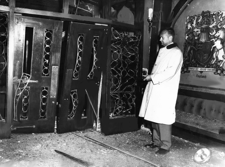 In 1964 Chicago Daily News columnist Mike Royko reported that the Illinois Fire Marshall William Cowhey said he was puzzled about what was going on. During a press meeting, Royko wrote, “Cowhey’s eyes squinted, as if he were peering into the distance for something. ‘The . . . rhyme . . . or . . . the . . . reason,’ he said, slowly. ‘If we could . . . get . . . the . . . rhyme or . . . reason.” In another column Royko explained, “The duties of the fire marshal included going to the restaurant, viewing the gaping hole in the door, the shattered windows, the rubble in the street, and announcing to newsmen: ‘This is arson.’ This job out of the way, it is the fire marshal’s duty to crouch and pick up a piece of rubble and stare at it so a picture can be taken.” [Above, owner inspects damage at his Ivanhoe restaurant in Chicago, 1964]