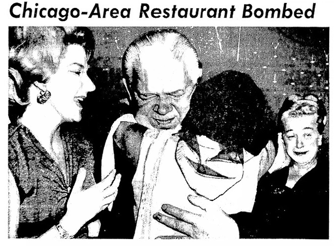Invariably, Chicago restaurant owners declared that they had no idea whatsoever about who had bombed them or why. More surprisingly, police also seemed strangely mystified. Very few bombers were ever caught or convicted. [Above, the owner of Wilkos in the Chicago suburb of Berwyn is comforted after 1964 bombing of his restaurant]