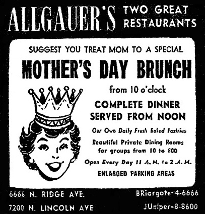 Beginning in the 1950s going out for brunch or dinner began to be a popular way to treat mothers on their annual holiday. But it seems to have lost its appeal somewhat in recent years. Has the idea of doing that waned with the public or is it because fewer restaurants are open on Sundays? Maybe restaurant staffs would like to celebrate the day themselves. But it is more likely that going out to eat on Sundays, once very popular, has become less so and restaurants don’t find it worthwhile to stay open. And, could it be that brunch has lost its appeal as well? [Above: Allgauer’s ad, Chicago, 1956]