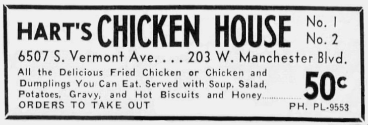 The restaurant’s history turned out to be difficult to research, but I did learn that both restaurants were in Los Angeles, and that No. 2 was at 203 W. Manchester Blvd. and No. 1 was on S. Vermont.