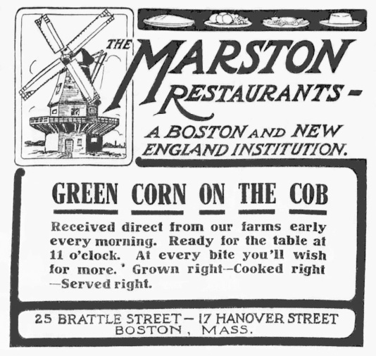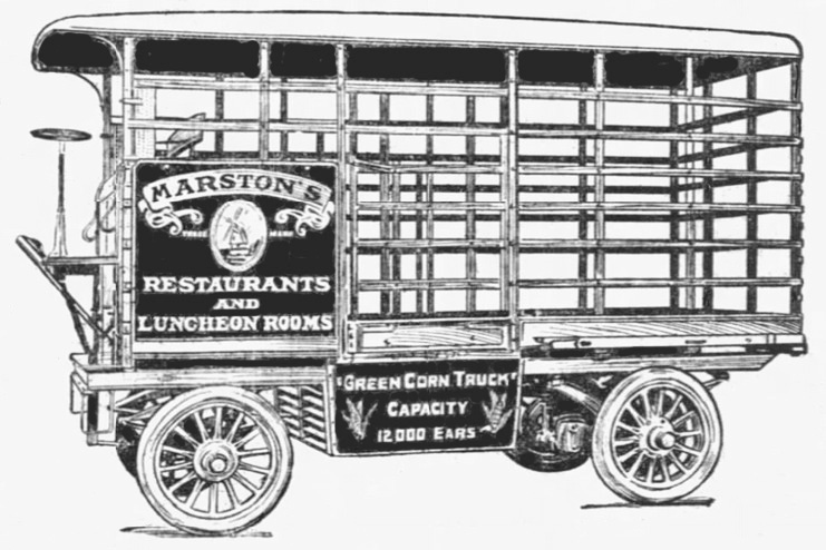 Popular menu items at Marston’s restaurants included corned beef hash and green corn, i.e., corn picked early. Shirley Marston, grandson of Russell, opened a cafeteria in 1926 which featured green corn in season. He emphasized in a 1926 interview that his cafeteria was the only place he knew of where “corn picked before sunrise is served the same day.” [Shown above: 1911 ad; Below: 1906 wagon that brought the green corn from the Marston farm]