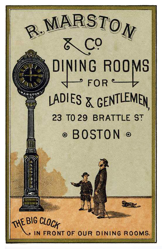 Russell’s brother George was also involved in running the Brattle street place, but in 1866 Russell became the sole proprietor. He began to enlarge, and spread into neighboring Brattle Street buildings, eventually simultaneously occupying three in a row. [Above” 1881 drawing of the Brattle Street Marston enterprise] A few years later his son Howard became his business partner. By 1881 the restaurant at 23 Brattle held 250. To mark the spot, a stately Howard municipal clock inscribed with the Marston name stood in front of the restaurants on Brattle street. [shown below]