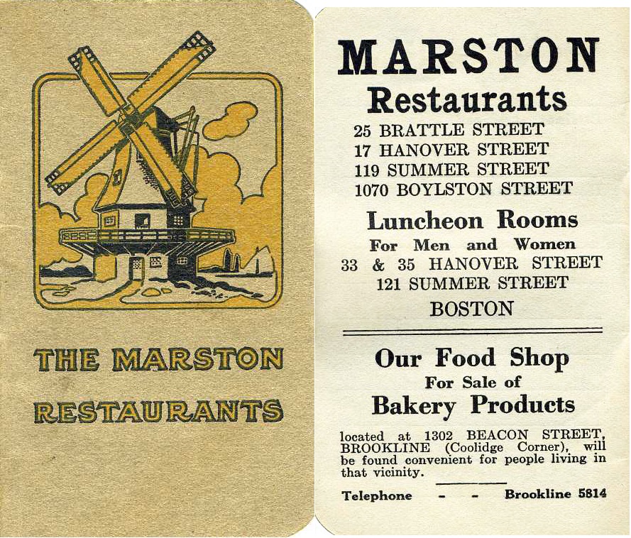 But nothing lasts forever. The Marston kingdom began to crumble in 1918 when the Washington location was closed, with a dismal advertisement that said all fixtures had to be sold by a given date “regardless of price.” Then, Howard Marston died in 1924. The remaining locations carried on for a few years, but in 1926 the family sold all its stock to a syndicate of local men who kept the Marston name. The new owners were not successful in keeping them open for more than a few years. On February 25, 1928 the Globe ran a story with the headline “Marston Restaurants Pass Into History with Closing Tonight,” noting that many of the workers at the Brattle-Hanover Street location had been there for over 30 years. [Above: Ca. 1920s cover and interior page of a small advertising notebook that gives no hint that the “empire” is about to fall.]