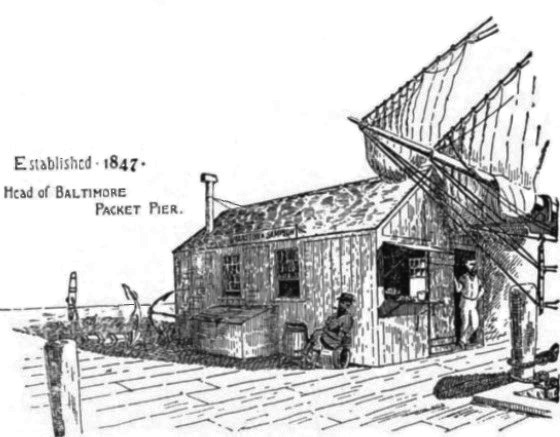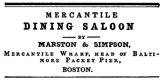 Restaurant is a rather glorified term for his first venture on land. He and his former ship’s cook took over a place on the Baltimore Packet Pier in Boston in 1847. It was tiny, seating only twenty [pictured above]. Nonetheless it was popular and in 1850 they built a new place on the pier, describing it as “beautiful, spacious and commodious.” They named it the Mercantile Dining Saloon. [1851 Advertisement with misspelled name of Marston’s partner] Perhaps it also proved to be too small, because in 1853 they moved and “thoroughly renovated” a new place at 13 Brattle Street.