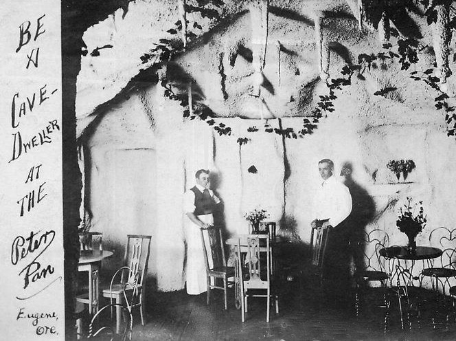 The layout of the building accommodated a small tea garden inside the front door that was outfitted with trees and fountains. Next came a two-story dining room accommodating hundreds, with a ceiling imitating a blue sky with twinkling stars and surrounded on all sides by a balcony that also held tables for guests. Two ends of the building provided people entering from the street access to two interior lunch counters with soda fountains. [Above: one of the lunch counters, but looking strangely like a bar.]