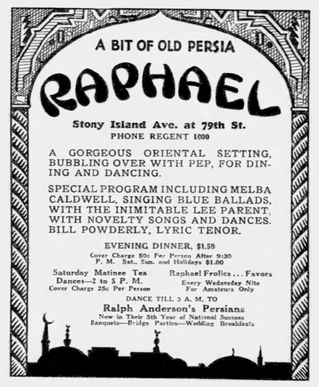 A reader of The American Restaurant would be left with the idea that Raphael’s was an elegant place catering to a clientele with sophisticated tastes. But that idea was dashed in a story written by a young reporter who spent a night there playing the part of a “shy cigaret girl.” Over the course of the evening male patrons hit on her nine times. She also observed people drinking alcoholic drinks, probably enhanced by their own whisky flasks. The crowd included teenagers. By June of 1929, the restaurant was reduced to featuring a “crystal gazer” on the balcony named Allah Mahalla. So much for elegance!