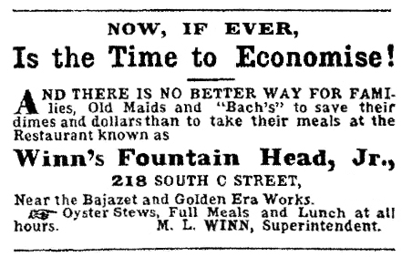 As far as his many business schemes went, he never stuck with any of them for long, restaurants included. He bounced around Maine, Boston, New York City, Albany NY, San Francisco, Virginia City NV, and finally back to New York City where he died in 1881. His San Francisco restaurants were the most successful of his enterprises, but despite their promise he held onto them only for about six years.