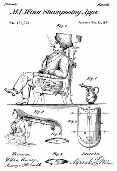 Apparently he didn’t strike it rich, though, because after five years in Virginia City he filed for insolvency and the Winns returned to San Francisco where he began work on the invention of a shampooing device that was patented in 1871 [shown above].