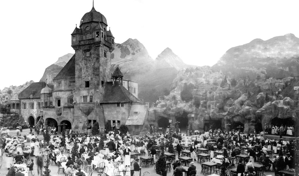 The layout of the building accommodated a small tea garden inside the front door that was outfitted with trees and fountains. Next came a two-story dining room accommodating hundreds, with a ceiling imitating a blue sky with twinkling stars and surrounded on all sides by a balcony that also held tables for guests. Two ends of the building provided people entering from the street access to two interior lunch counters with soda fountains. [Above: one of the lunch counters, but looking strangely like a bar.]