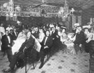 Shore dinners also attracted bicyclists. In 1899 a cyclist traveling along the shore from New York City to Boston stopped at Hammonasset Point in Madison CT for a dinner that included clam chowder, bluefish, steamed clams, boiled lobster, potatoes, corn, tomatoes, cucumbers, pudding, ice cream, coffee, and milk – all for 50 cents. And an abandoned church turned restaurant and bowling alley in Undercliff NJ [pictured] did a brisk summer business in clam chowder with cyclists traveling along the Hudson River cliffs.