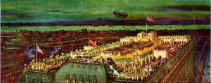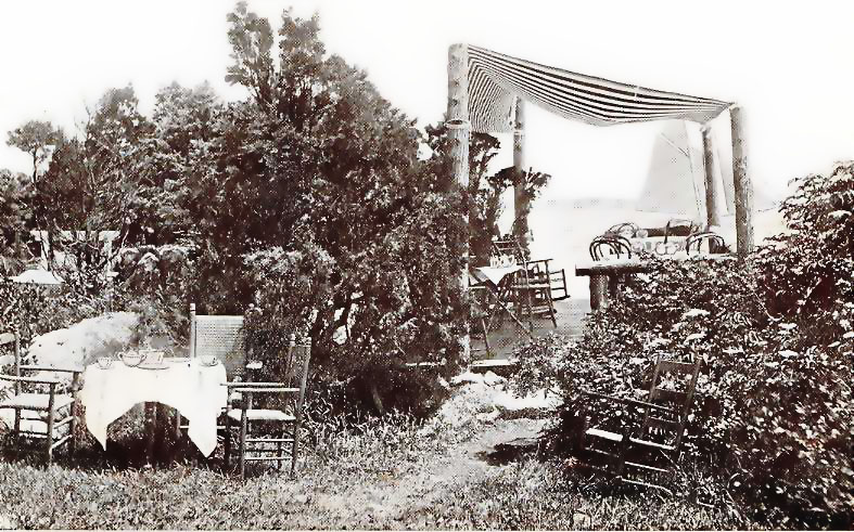 In truth dining outdoors was enjoyed by Americans mostly when they were in tourist mode, at the seashore or in Europe. Seasonal tea rooms delightfully situated in places such as Marblehead MA (pictured) commonly offered afternoon tea, lunch, and dinner on porches, lawns, and patios. World’s fairs were another place to enjoy Continental ways. Beginning with the 1876 Centennial in Philadelphia, fairs always included provisions for dining al fresco.
