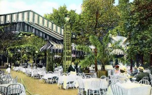 Outdoor gardens where patrons consumed mead, lemonade, and light snacks gave way around the Civil War to German beer gardens (Bismarck Gardens, Chicago, pictured) which, like tea gardens, were often situated on the outskirts of cities. They continued until the second decade of the 20th century when burgeoning suburbs wishing to eliminate alcohol purveyors succeeded in closing them down. Prohibition also defeated the dreams of American soldiers returning from WWI who had enjoyed sidewalk cafes in Paris and wanted to reproduce them in their homeland. But would they have caught on in a pragmatic country like America so dedicated to business and industry that sitting at a sidewalk café seemed like decadent loafing?