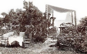 Department stores adopted garden motifs as did tea rooms where one could dine in an actual garden or, in rural New England, on the front lawn of the proprietor’s home. Tea rooms that chose a garden theme for indoors leaned heavily toward a Japanese style invoked rather simply with flower-strewn trellises and a bit of wicker or paper lanterns, as did Schrafft’s in Syracuse NY and the tea room at the Vantine store in NYC [above photo, 1906]. Actual Asian restaurants, on the other hand, were likely to include the word garden in their name, but that did not necessarily imply they had an actual garden.
