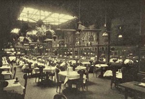 Dining in a garden once again became popular in the early 1900s, only now, in addition to outdoor gardens such as New York’s Terrace Garden and others on the roofs of tall buildings, there were many indoors, making them available year round. Natural touches included pendulous boughs draped from ceiling lattices, burbling fountains, potted palm fronds that threatened to tickle guests’ necks, and sometimes blue-painted ceilings twinkling with tiny stars.