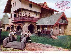In preparation for the 1904 St. Louis World’s Fair (the Louisiana Purchase Exposition), Faust joined half a dozen of St. Louis’s top restaurateurs in a trust, the St. Louis Catering Company, probably designed to buy in large quantities and possibly to set prices too. Faust went into partnership with New York’s Lüchow’s to create a Tyrolean Alps Restaurant at the Fair which seated 5,000 diners and featured costumed singers (pictured). It represented brewers’ interests as well, leading one observer to joke that the enormous beer hall should have been named “Budweiser Alps.” According to the Fair’s Official Program there was also a Faust restaurant in the Fair’s west pavilion on Art Hill.