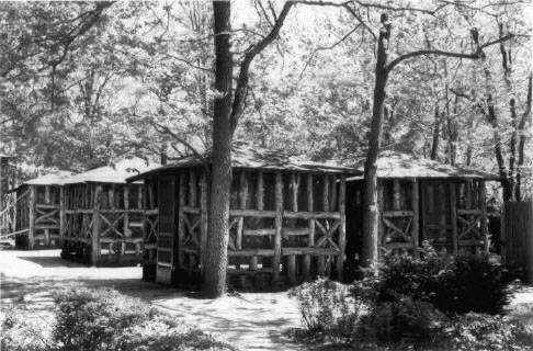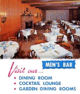 I ate there just once, in the 1970s. I wanted to experience eating in one of the screened-in log huts in the restaurant’s back yard (pictured, courtesy Esley Hamilton). Even then they seemed quaintly out of sync with the times. I have no idea what I ate. What sticks in my mind is the elderly woman alone in the next hut with her dog. I remember a tall, white coated waiter bringing the dog’s dinner, a large serving of prime rib.