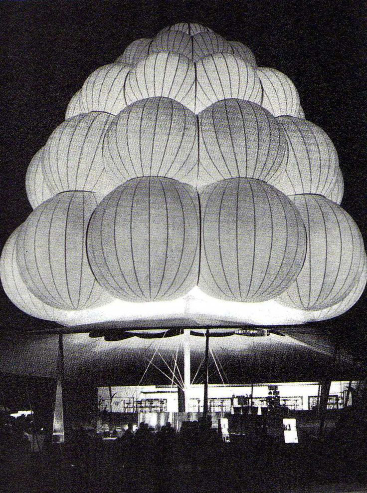 Biggest of all, the Brass Rail operated six moderate-priced restaurants, each offering a single complete meal for $3. In the International Plaza they ran both a cold Danish buffet and the Garden restaurant offering Southern fried chicken dinners. The company, a subsidiary of Interstate Vending Co. in Chicago, also had 25 freestanding snack bars with balloon-shaped roofs that looked as though they could lift off and float away.