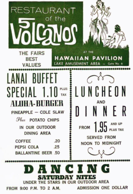 Representing American-style Chinese food was the Chun King Inn, whose mission was not so much to run a profitable restaurant as to familarize people with Chun King products sold in supermarkets. It won over the public — who often complained about high restaurant prices at the Fair — by serving full meals consisting of seven items for only 99 cents. The Inn also featured a double-patty Hong Kong Burger with cheese, lettuce, special sauce – and bean sprouts for an Asian touch. Many restaurants did poorly at the Fair, but Chun King’s president reported that the Inn served 5 million customers the first year.