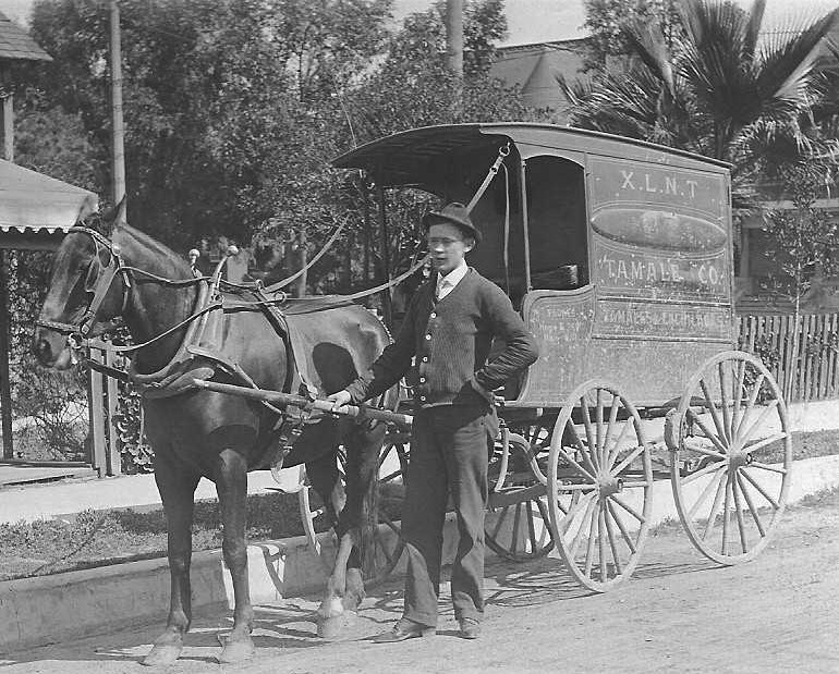 The corn husk specialty grew as companies got into the canned tamale business, beginning around in the early 1900s. Some, such as the X. L. N. T. Company of Los Angeles, delivered tamales to homes [above, 1908]. A publication of the California State Federation of Labor claimed that by 1916 canned tamales had become so popular that the leading packing company was selling 4,000,000 cans of its I. X .L. brand annually. In Mexico, tamales were wrapped in the white inner husks; the packing industry, by contrast, bleached the green husks. Still, bleaching was better than unsanitary tamale production such as that uncovered in Ohio in 1900 where the corn husks were obtained from old mattresses. As might be expected the canned tamale business cut into street trade.