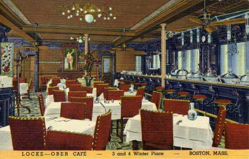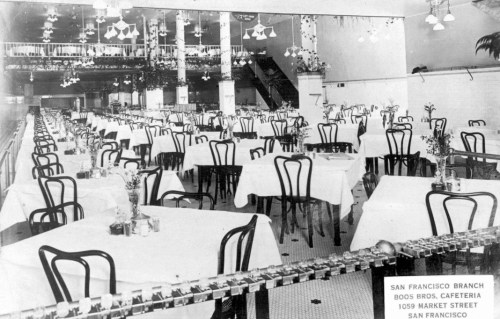 The layout of the building accommodated a small tea garden inside the front door that was outfitted with trees and fountains. Next came a two-story dining room accommodating hundreds, with a ceiling imitating a blue sky with twinkling stars and surrounded on all sides by a balcony that also held tables for guests. Two ends of the building provided people entering from the street access to two interior lunch counters with soda fountains. [Above: one of the lunch counters, but looking strangely like a bar.]