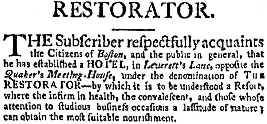 Deliveries included soups – a specialty of restorators – oysters, and full meals. A typical newspaper notice would closely resemble that of J. B. LeRebour of Salem MA in 1800, offering “all the delicacies that the season and market can afford . . . dressed for the epicure . . . Families in town may be supplied with Dinners and Suppers at the shortest notice.”