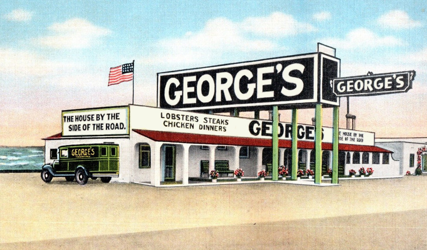 Before neon, efforts to craft signs that could attract distant or speeding traffic were undoubtedly less successful, less visible in the dark. George’s grotesquely large sign shown below, for example, was neither attractive nor sufficiently visible at night. As a slightly later version of this postcard revealed, the restaurant soon found it necessary to add spotlights atop the sign.