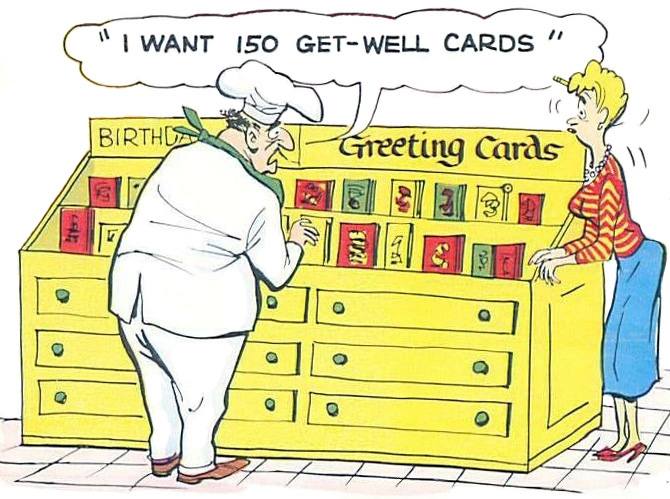 Generally, tracing reported cases to their source has always been quite difficult and most are not reported at all. Victims often think they have the mythical “24-hour flu.” Or they might attribute their distress to the last meal they ate in a restaurant when the source could well have been something consumed days earlier. In the case of Campylobacter, it has been estimated that as many as 2M people are afflicted each year (though not solely from restaurant meals), leading to more than 10,000 hospitalizations. Salmonella may afflict somewhat fewer people but causes more hospitalizations and deaths. [Above: 1989 cartoon still using the term “ptomaine”]