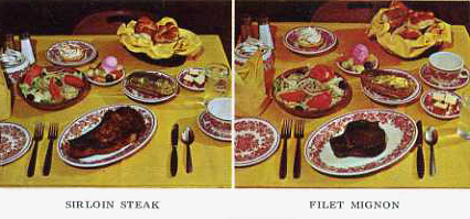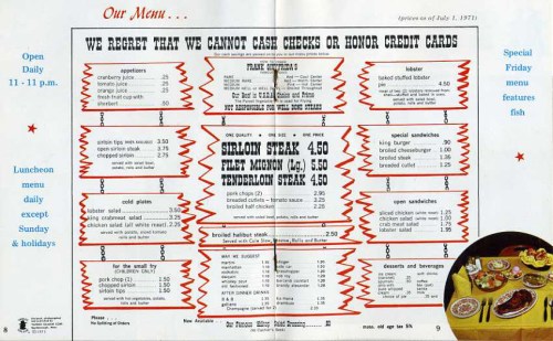 And, yes, that is also true of Chicken in the Rough, a franchised process for preparing fried chicken. As recently as now, Palms Krystal Bar & Restaurant in Port Huron MI offers “The World’s Most Famous Chicken Dish,” as it has for decades. In 2000 a Palms order consisted of an unjointed half fried chicken, with shoestring potatoes, hot bun, and jug of honey. Two orders cost $9.99 and they even threw in free coleslaw. In the 1930s an order usually was priced at 50 cents. [above, 1940s menu from an Arkansas restaurant]